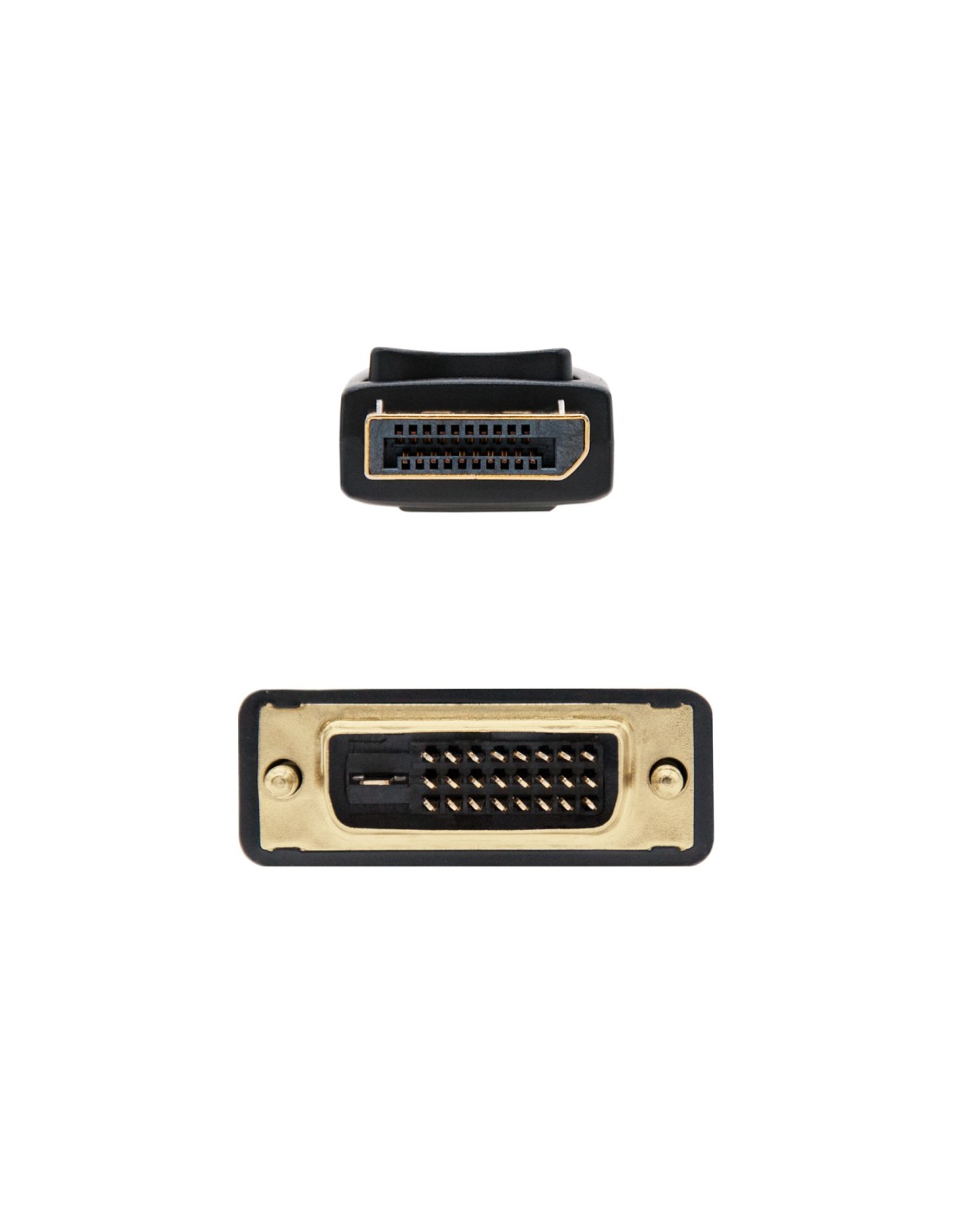 Cable conversor DisplayPort macho en un extremo y DVI macho en el otro.