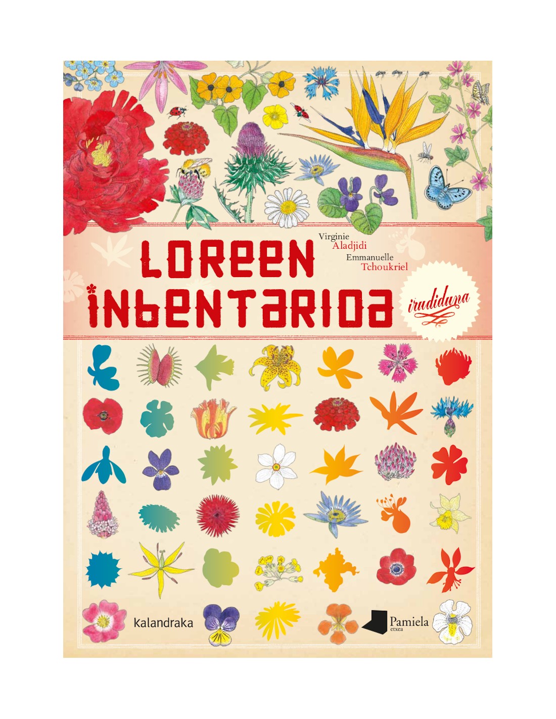Gida ilustratu atsegin eta zehatza, loreen mundu harrigarrian barneratzeko. «Loreen inbentarioa (irudiduna)» izeneko honen orrialdeak kolorefesta bat dira, eta, 62 lore motaren eskutik, mundu guztian zehar eramanen gaitu bidaian: Hego Afrikako eskualdeetatik Indonesiako Sumatra uharteraino, Europako belardietan barrena. Lore basati nahiz landatuak modu originalean sailkatuta daude, kolorearen arabera, errazago aurkitzeko, eta lamina bakoitzean espezie bat edo bi ageri dira, izen arrunta eta zientifikoa adierazita, baita altuera eta loraldia noiz den ere. Horrekin batera, deskribapen labur batean zenbait gai lantzen dira, hala nola jatorria, sendabelar gisa duten erabilera, bitxikeria zenbait eta kontserbazio-egoerari buruzko ohartarazpenak. Bilduma honetako liburu guztietan bezala, Emmanuelle Tchoukrielen ilustrazioak zehatzak eta errealistak dira, garai bateko landakoadernoen gisan. Loreekin batera, xehetasun batzuk handiagotuta erakusten dira;besteak beste, sustraiak, petaloak, haziak eta inguruko beste biztanle batzuk: intsektuak, anfibioak, hegaztiak eta belarjaleak, esaterako.