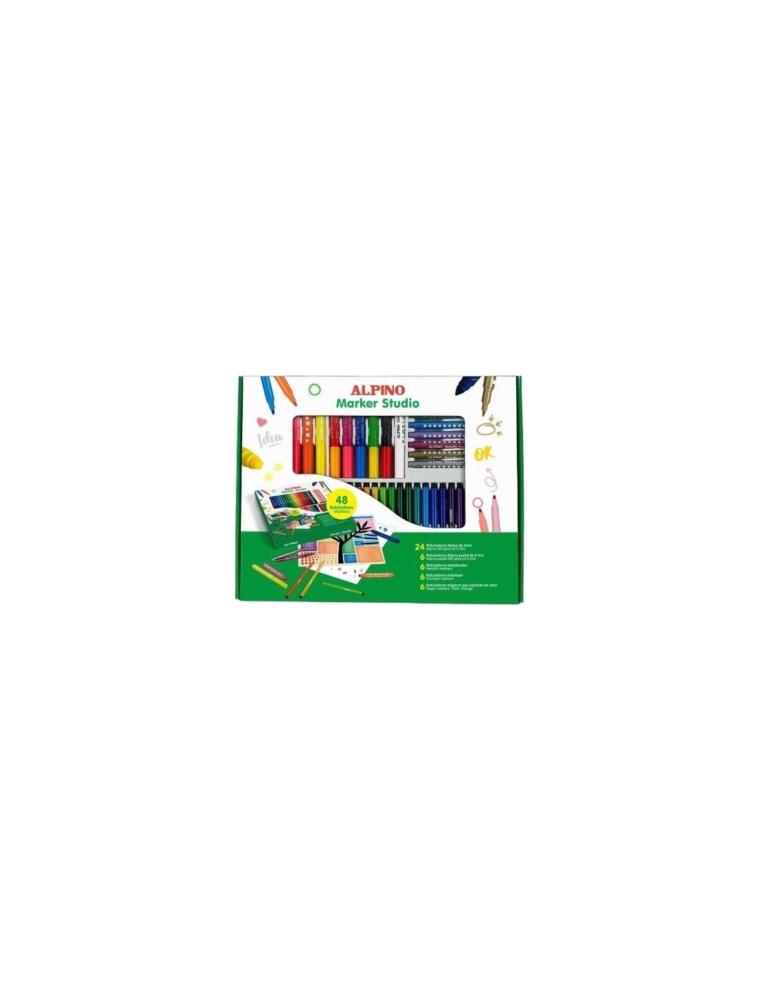 Contenido del estuche: - 24 Rotuladores alpino. - 6 Rotuladores alpino pastel. - 6 Rotuladores alpino metálizados. - 6 Rotuladores mágicos. - 6 rotuladores stmamper.