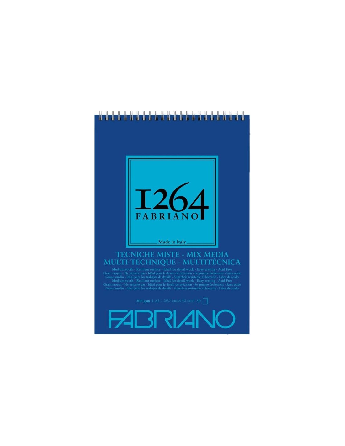Fabriano 1264 Mix Media es un papel blanco suave de grano natural con tratamiento especial de encolado. Es adecuado para todas las técnicas secas (esbozo con lápiz, dibujo con lápìces de colores, etc.) y húmedas (gouache, acuarelas, etc.). Hojas microperforadas.