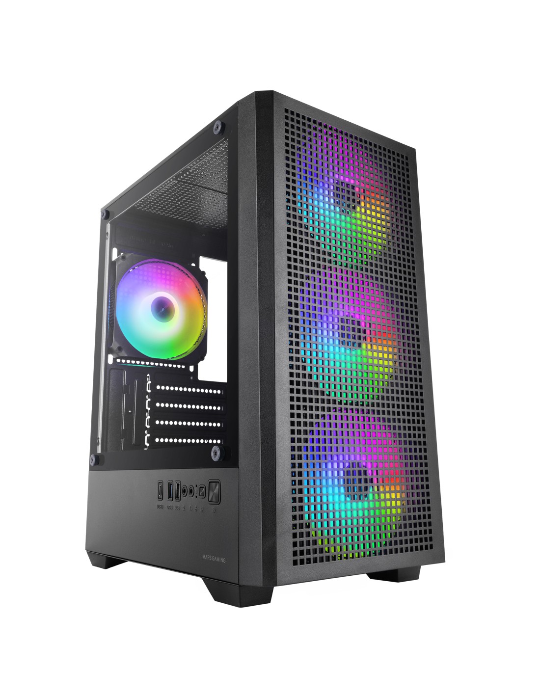 Mars Gaming MC-VECTOR, Caja Gaming Micro-ATX, 4 Ventiladores ARGB 120mm FDB Incluidos, Cristal Templado, Panel Frontal Full Mesh, Doble Cámara, Soporte Refrigeración Líquida 120mm, USB-C, Negro