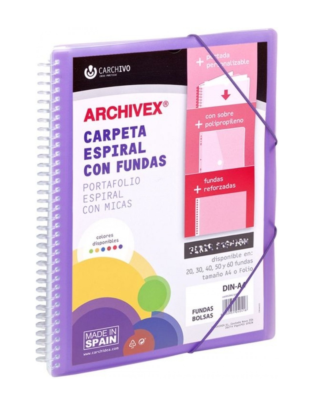Carpeta de espiral indeformable que contiene 30 fundas de polipropileno tamaño A4 con refuerzo;la portada es tipo canguro para personalizar, incluye sobre en la parte posterior y cierre de goma.