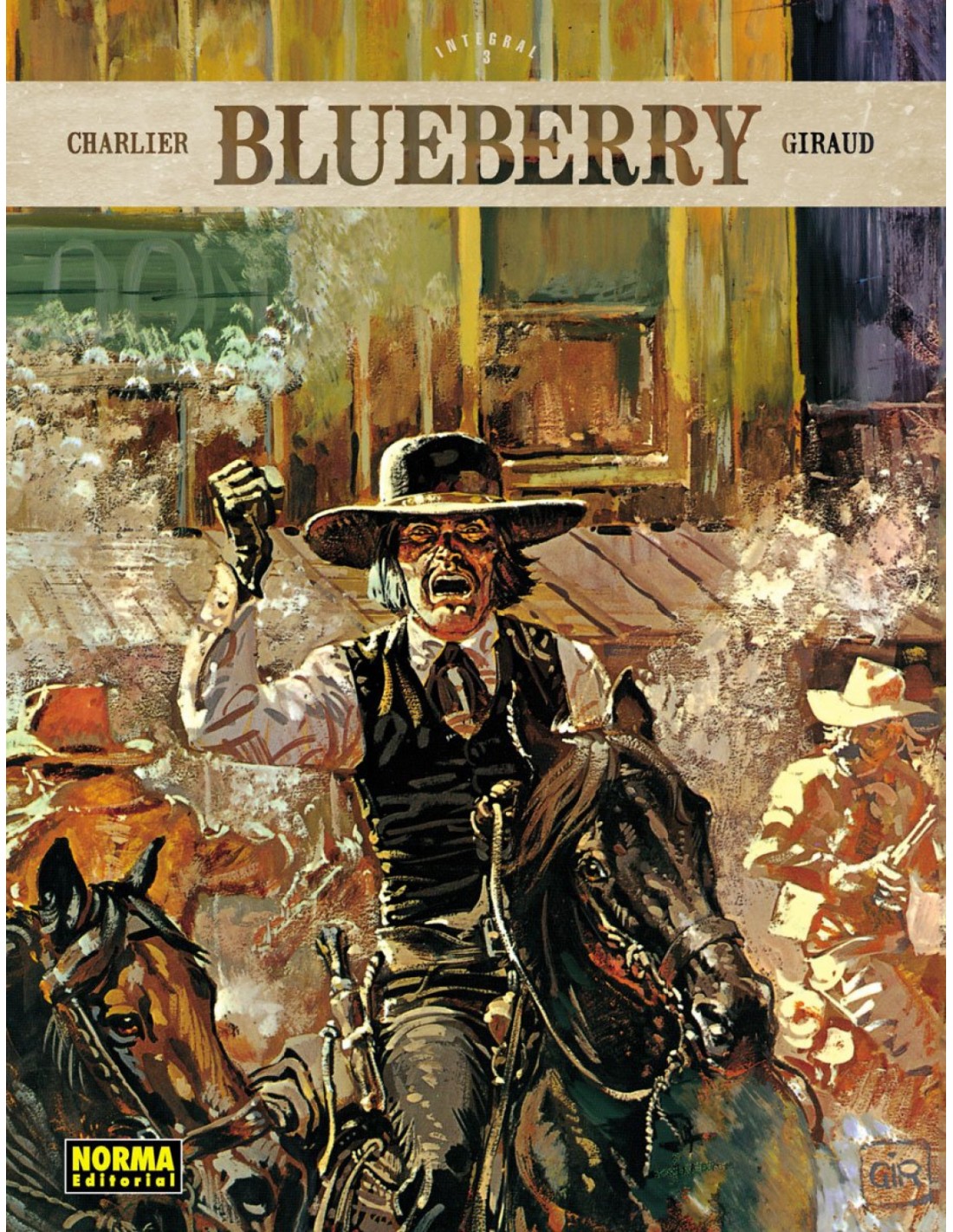 TERCER INTEGRAL DEL WESTERN CUMBRE DEL GÉNERO La primera aventura de Blueberry apareció en 1963, escrita por Jean-Michel Charlier y dibujada por Jean Giraud (Moebius), que se inspiró en el actor Jean-Paul Belmondo para caracterizar al teniente de la Guerra de Secesión americana. Años después, Blueberry es indiscutiblemente una de las cimas de la historia del cómic. Con esta serie de ediciones integrales, ponemos por primera vez al alcance del público la colección en su orden cronológico y recuperamos sus colores originales, tal y como aparecieron por primera vez en la revista Pilote. Este tercer integral contiene los siguientes títulos: El caballo de hierro, El hombre del puño de acero y La pista de los sioux.