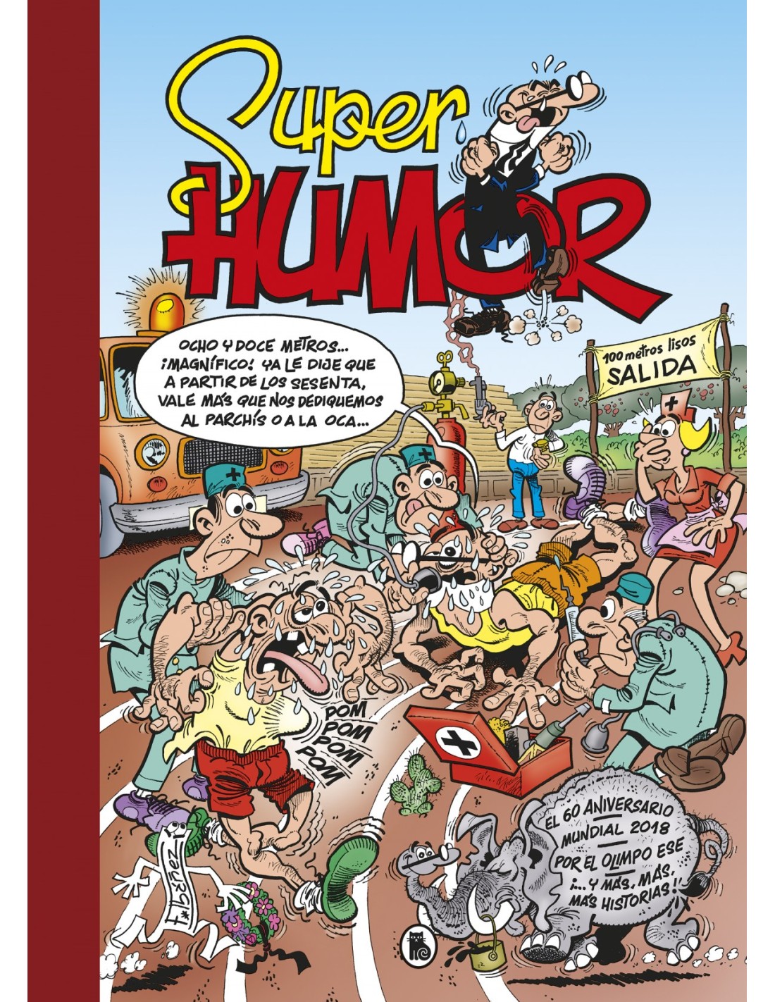 Número 63 de la colección «Súper Humor» de Mortadelo y Filemón. íLas últimas novedades de Mortadelo y Filemón recogidas en un solo libro! Este álbum contiene las aventuras El 60 aniversario, Mundial 2018, Por el olimpo ese y una recopilación de aventuras cortas de Mortadelo y Filemón. El 60 aniversario: En esta aventura, Mortadelo y Filemón, llenos de achaques por la edad al igual que los demás miembros de la TIA, tendrán que viajar a Kolea d'Aliba con el fin de promover la paz entre el gobernador de ese país, Pxing Pxong, y el presidente de los Estados Juntitos, Mr. Donald Trompf. Mundial 2018: Cada cuatro años, con motivo de la celebración de los mundiales de fútbol, Mortadelo y Filemón viven sus aventuras en el país anfitrión. En esta ocasión, los famosos agentes de la T.I.A. viajarán a Rusia, donde tendrá lugar el Mundial de Fútbol 2018. Por el olimpo ese: El profesor Bacterio ha creado un campo magnético que transforma a la gente que se sitúa en su radio de acción en seres mitológicos como tritones, faunos, centauros y otros. El Súper pide ayuda a Mortadelo y Filemón mientras le duren los efectos, porque se ha transformado en un centauro. Ofelia se transforma en sirena, el contable de la T.I.A. en minotauro... toda una epidemia. ________________________________________________________ __________________ La colección «Súper Humor» empezó a publicarse en la editorial Bruguera en el año 1975. Sus números recopilaban aventuras aparecidas anteriormente en la colección «Olé!», mezclando diversos personajes de la casa en un mismo álbum, aunque siempre priorizando los de Ibáñez y Escobar. Posteriormente, en 1987, Ediciones B recuperó la colección manteniendo su formato original hasta 1992, momento en el que se empezó a hacer distinción por personajes, pudiendo encontrar «Súper Humor» seriados de Mortadelo y Filemón, Superlópez, Zipi y Zape, etc. En la actualidad se publica un único número de «Súper Humor» al año con las últimas novedades de las series de Mortadelo y Filemón y Superlópez.