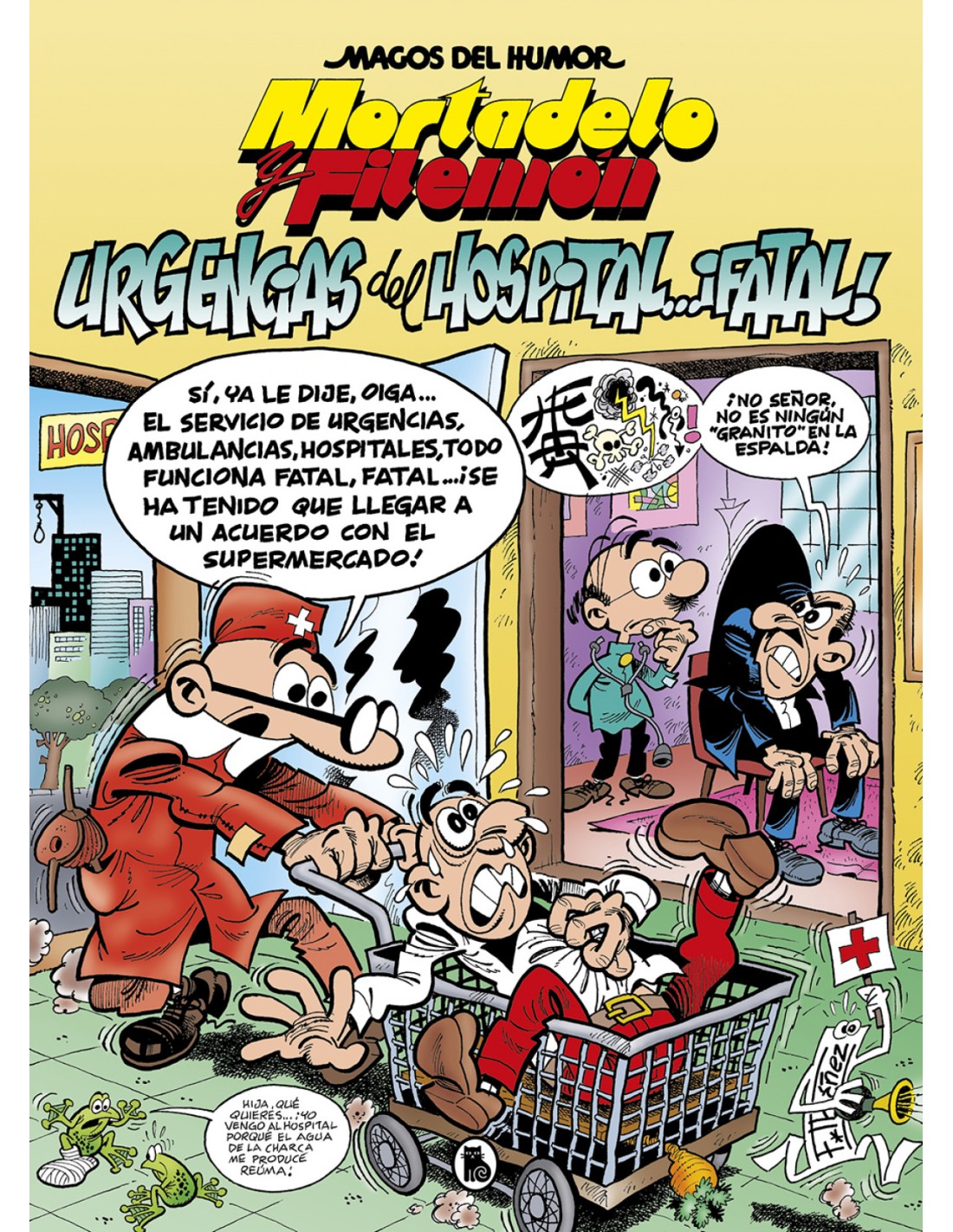 Número 194 de la colección «Magos del humor». íLa nueva aventura de Mortadelo y Filemón tendrá lugar en las urgencias de un hospital, con el médico Rompetechos! Las urgencias de los hospitales están colapsadas y todo va patas arriba, a raíz de esta situación se están abriendo cada vez más hospitales privados. El Súper les encarga a Mortadelo y Filemón que se infiltren en los hospitales, para ver qué está sucediendo. Para ello se disfrazan de doctores y, en uno de estos hospitales, conocerán al cirujano jefe, que no es otro que Rompetechos. Sobre la colección: La colección «Magos del Humor» nació en la editorial Bruguera en el año 1984 recuperando títulos que ya habían sido publicados en su antecesora «Ases del Humor» (1969). Debido al cierre de Bruguera en 1986, en esta etapa solo llegaron a ver la luz los primeros 12 volúmenes de la serie, pero en 1987 Ediciones B retomó la publicación de la colección desde su primer número hasta la actualidad. «Magos del Humor», con su formato coleccionista en tapa dura de 210 x 290 mm, es la colección en la que aparecen por primera vez las aventuras inéditas de Mortadelo y Filemón y de Superlópez, aunque también puede encontrarse material de grandes personajes de Bruguera como Zipi y Zape de Escobar, 13, Rue del Percebe, Pepe Gotera y Otilio, El botones Sacarino, La familia Trapisonda y Rompetechos de Ibáñez, Los cuentos de tío Vázquez o La familia Cebolleta de Manuel Vázquez, entre otros.