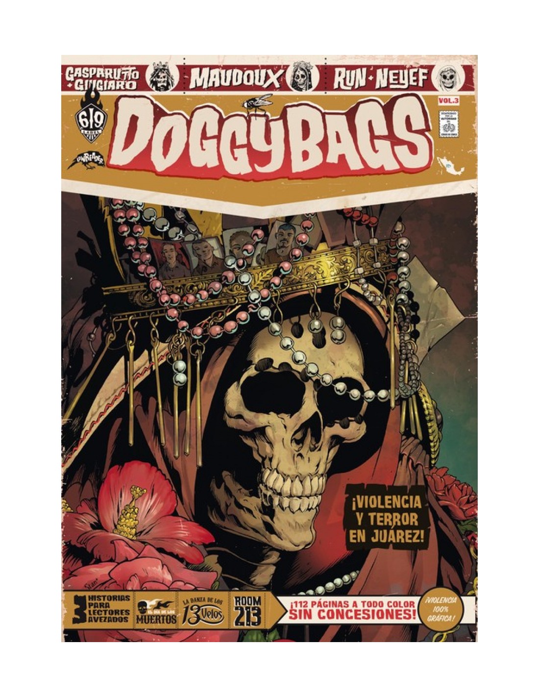 Llega Doggy Bags 3 con tres nuevas historias en un monográfico dedicado a México, ambientado en la Ciudad de Juárez, capital mundial del crimen, el narcotráfico y los secuestros. En este tercer volumen damos la bienvenida a tres nuevos autores. Gasparutto y Giugiano nos traen El día de los muertos, una historia ambientada en esa festividad y en el que un policía orquesta la venganza contra el cártel más temido de la ciudad. Y Neyef que nos ofrece junto a Run la historia Room 213. Un líder de un famoso cártel es perseguido por la Santa Muerte para que pague por los crímenes cometidos. La tercera historia recae sobre Florent Maudoux quien ya participó en el volumen 1. En La danza de los 13 velos, disfrutamos una vez más del magnifico personaje de Masiko que buscará revancha a través de la exótica y sensual danza de los velos.