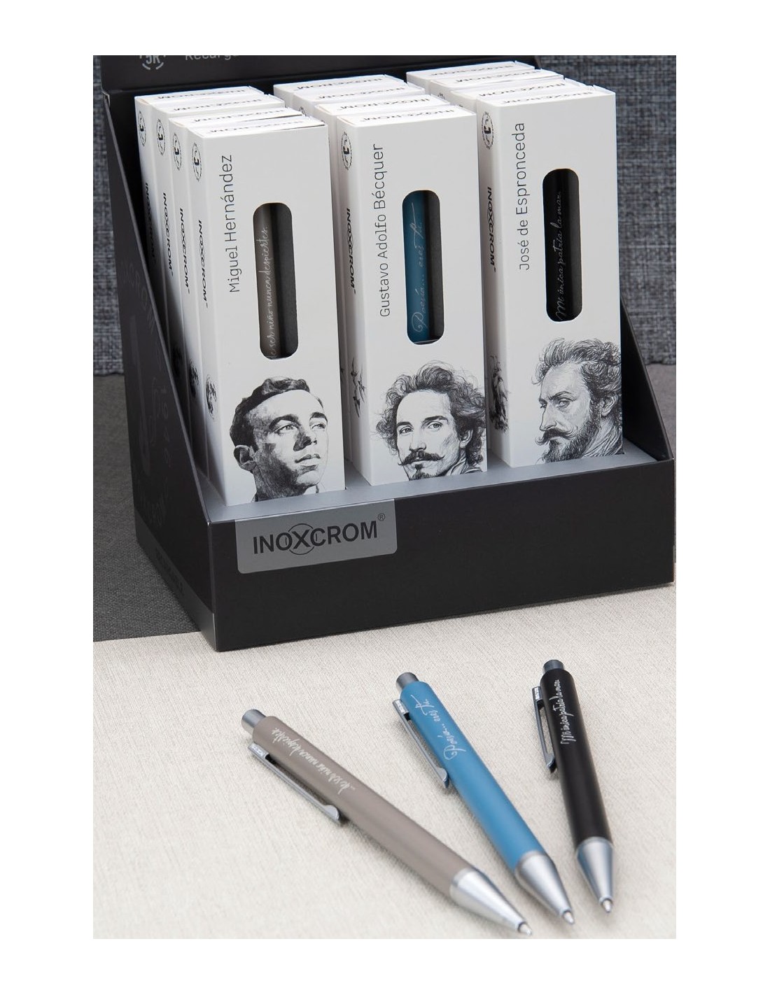 Bolígrafos de aluminio lacado mate y grabado láser con cita del autor con mecanismo de pulsación y líneas puras y minimalistas. Colección especial de grandes poetas de la literaturas. Recambio de bolígrafo INOXCROM« con punta de acero inoxidable y bola de carburo de tungsteno de 1mm. Estuche regalo C-BOX decorado a juego. Modelo coleccionable. Obsequio de 12 marcapáginas a juego.'