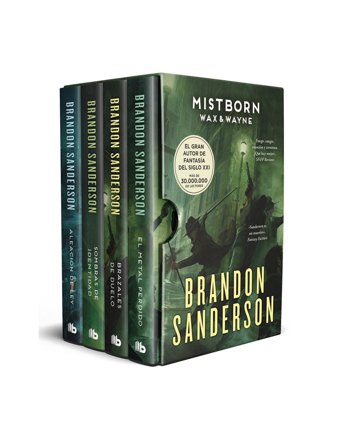 Una serie de tensión, intriga política y mágica. Un must have de la mano del gran renovador de la fantasía del siglo XXI, Brandon Sanderson. Trescientos años después de los eventos de la trilogía Mistborn, Scadrial se encuentra al borde de la modernidad: ferrocarriles, canales, iluminación eléctrica, rascacielos Y aunque la ciencia y tecnología juega un papel importante en el desarrollo de la ciudad, la antigua magia de la alomancia sigue siendo fundamental.En este estuche encontrarás: Aleación de ley Sombras de identidad Brazales de Duelo El metal perdido