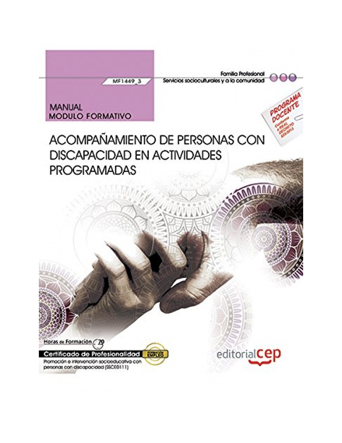 Acompañamiento de personas con discapacidad en actividades programadas (MF1449_3) es uno de los módulos pertenecientes al Certificado de Profesionalidad Promoción e intervención socioeducativa con personas con discapacidad (SSCE0111), publicado en el Real Decreto 625/2013. Este manual sigue fielmente el índice de contenidos publicado en el Real