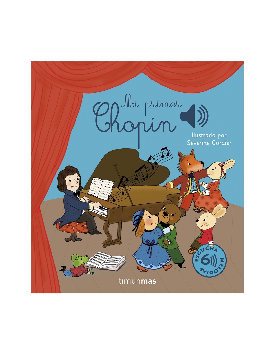 Cada ilustración de este libro esconde un botón que hará sonar melodías de música clásica de Chopin. El sonido de calidad y las preciosas ilustraciones hacen que esta colección de libros de sonidos no pare de crecer.¡Mi primer libro de sonidos para descubrir a Frédéric Chopin! En cada doble página encontrarás un botón que hará sonar un fragmento de una obra de música clásica. ¡Deja volar la imaginación con el mágico sonido del piano! Una alegre ilustración acompaña cada melodía y hace que este recopilatorio de 6 composiciones de Chopin, especialmente pensado para los más pequeños, sea único. Este libro contiene las melodías Gran vals brillante, Polonesas, Vals del minuto, Gota de agua, La mariposa y Nocturnos. Mientras escucháis las melodías, podréis deleitaros con las imágenes. Las ilustraciones de este libro están inspiradas en la Europa del siglo xix, el escenario que vio nacer la música de Chopin. Podréis encontrar desde elegantes calles adoquinadas hasta relajantes parques repletos de color. En cada uno de estos paisajes se encuentra el compositor, junto a su inseparable piano, observando la belleza de la escena en busca de inspiración. Una manera de introducir la música clásica desde la primera infancia y despertar el oído y la sensibilidad musicales. Este libro musical es de cartón resistente, y los botones tienen el tamaño ideal para manos pequeñas, de manera que puedan disfrutarlo de manera autónoma. Recomendado a partir de 1 año. Ilustrado por Séverine Cordier Títulos de la colección de música clásica: Mi primer concierto de música clásica. Luces y sonidos Mis primeras canciones de música clásica. Luces y sonidos Mis primeras compositoras Mi primera historia de la música clásica Mis primeros instrumentos de música clásica Mis primeras óperas Mis primeras melodías clásicas Mi primer Carnaval de los animales Mis animales de la música clásica Mis primeras melodías para bebés Mis primeras canciones para bailar Mis primeras nanas Mis primeras canciones en inglés Mis melodías clásicas de Navidad Mis melodías jazz de Navidad Mi primer Beethoven Mi primer Mozart Mi primer Vivaldi Mi primer Bach