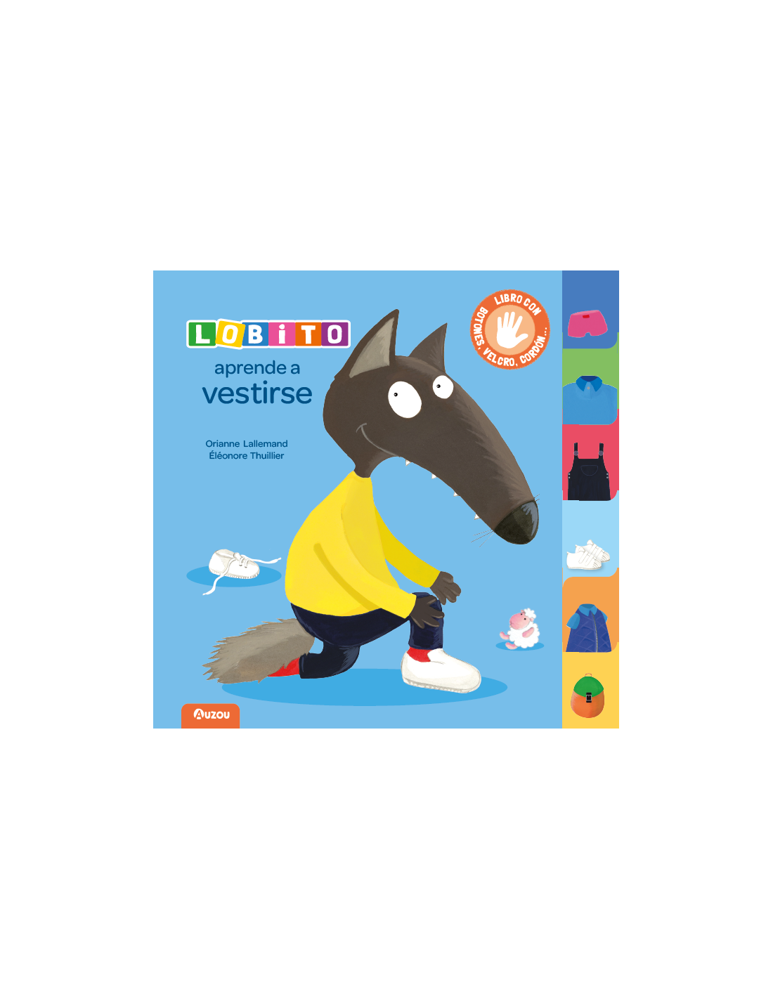 Lobito aprende a vestirse. Primero, los calzoncillos, luego el polo, las zapatillas... ¡sin olvidar el abrigo acolchado! Un libro de cartón con un mecanismo en cada página para aprender a dominar todas las etapas de vestirse: desde la cremallera hasta los velcros, pasando por los botones de presión.