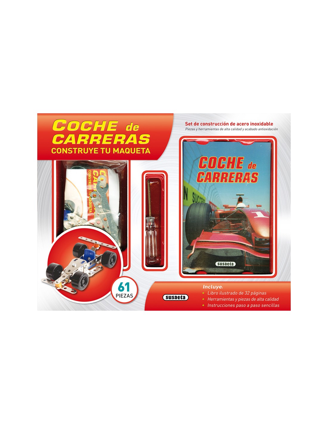 Construye tu propio coche de carreras con este set de construcción que incluye piezas de acero inoxidable de alta calidad, así como un libro que describe la historia de las trepidantes carreras de coches.