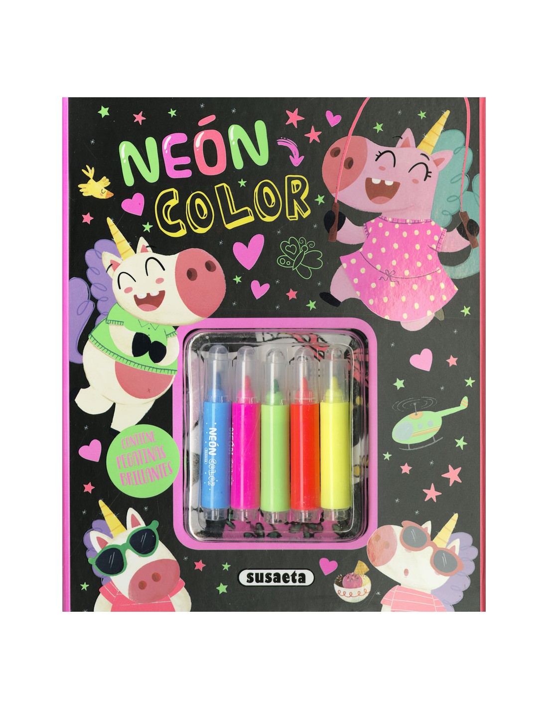 Colorea a estos simpáticos y juguetones unicornios con los rotuladores de neón y coloca las pegatinas brillantes donde más te guste. ¡Llena de vida las láminas del libro y haz que los dibujos brillen de forma mágica!