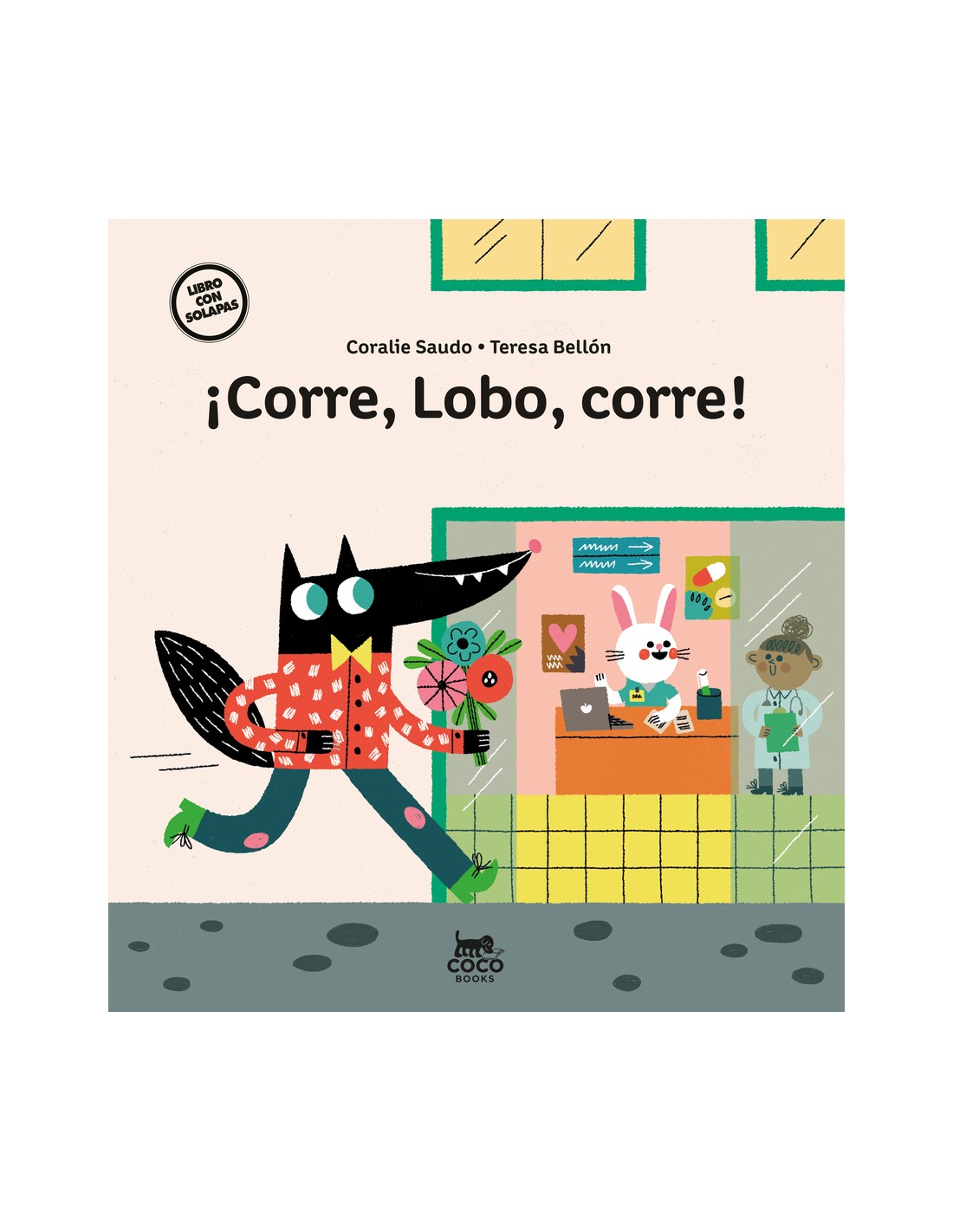 Suena el teléfono de Lobo. Es urgente. Corre al hospital con un ramo de flores. En cada página, el lector levanta las solapas para pasar a la habitación siguiente, ya que el lobo siempre se equivoca de lugar. Antes de encontrar la habitación correcta, el lector abre varias puertas y conoce a personajes famosos de los cuentos de hadas: uno de los tres cerditos, que recibió un ladrillazo en la cabeza;Ricitos de Oro, que se hizo daño al romperse su sillita... ¿Quién estará en la última habitación Un alegre giro final.