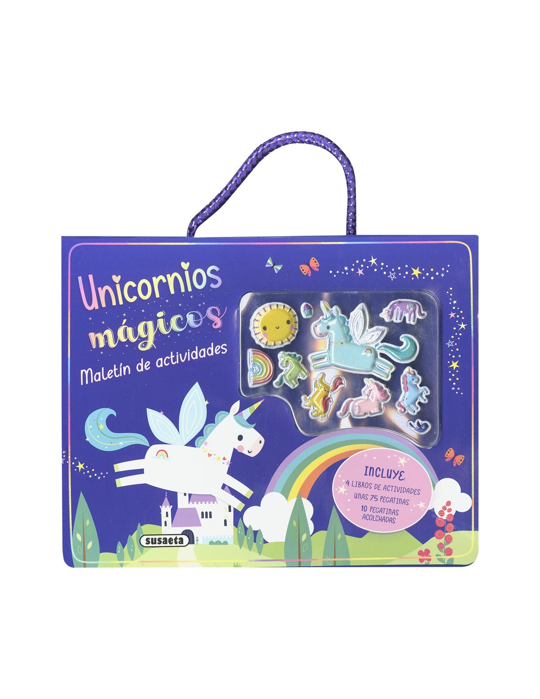 Un maletín con actividades de ensueño. Con 4 libros de actividades para jugar, colorear, dibujar y pasar un rato divertido. Incluye pegatinas para las actividades y 10 alucinantes pegatinas acolchadas.