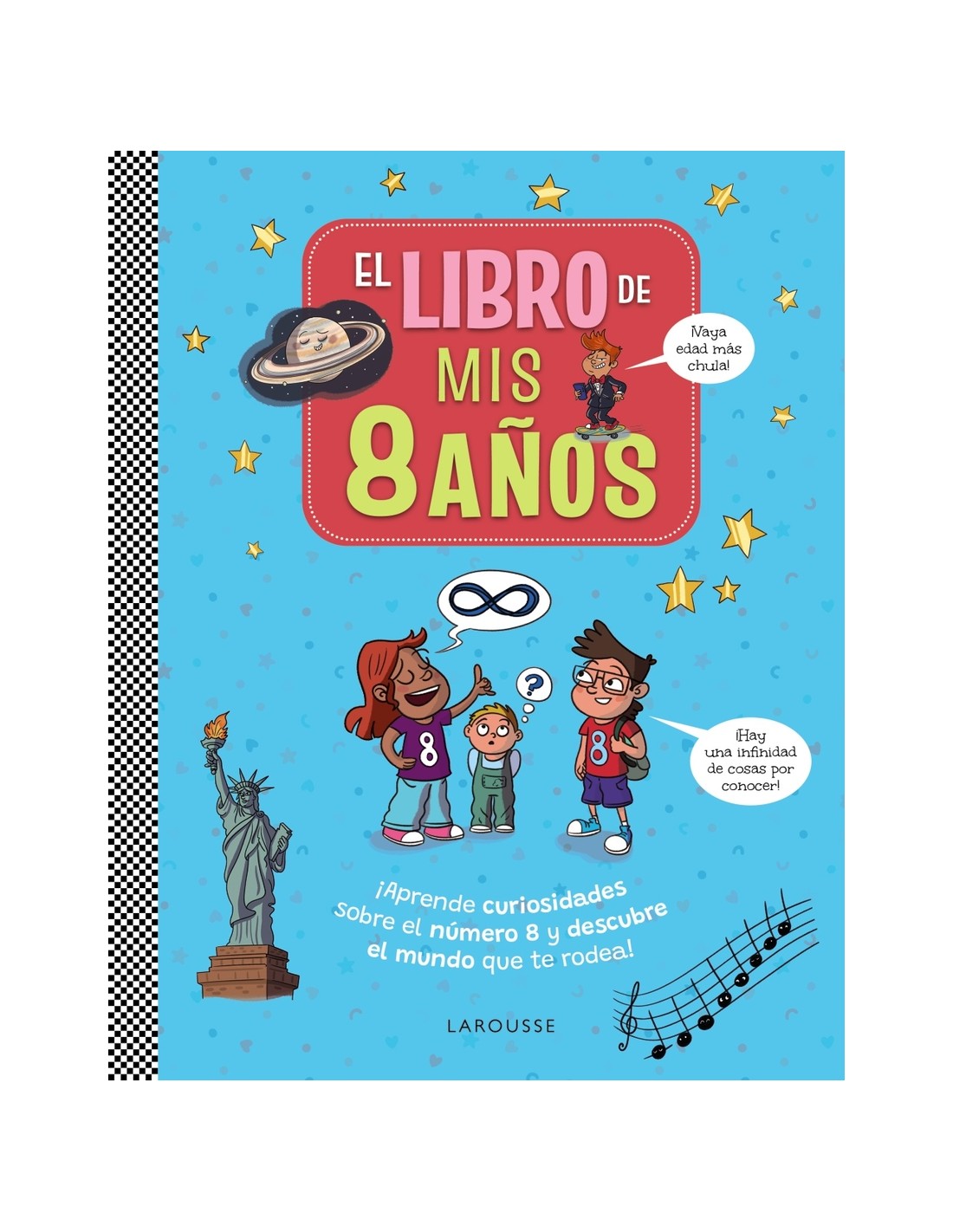 Descubre curiosidades del número ocho y del mundo que te rodea.¿De verdad que el número ocho es curioso En cualquier caso, hay ocho planetas en el sistema solar, las arañas y los pulpos tienen ocho patas, la escala musical tiene ocho notas y si el ocho se pone tumbado se transforma en el símbolo matemático del infinito...En este libro encontrarás ocho animales increíbles, ocho países curiosos, ocho ciudades que no te puedes perder, ocho personajes célebres o aprenderás a jugar al ajedrez en su tablero de 8 x 8 casillas, a través de los tres capítulos de la obra:-Descubre el mundo-¡Déjalos patidifusos!-No te lo pierdasSi tienes ocho años, aquí encontrarás informaciones, chistes y pasatiempos para tener un año lleno de sorpresas y descubrimientos.