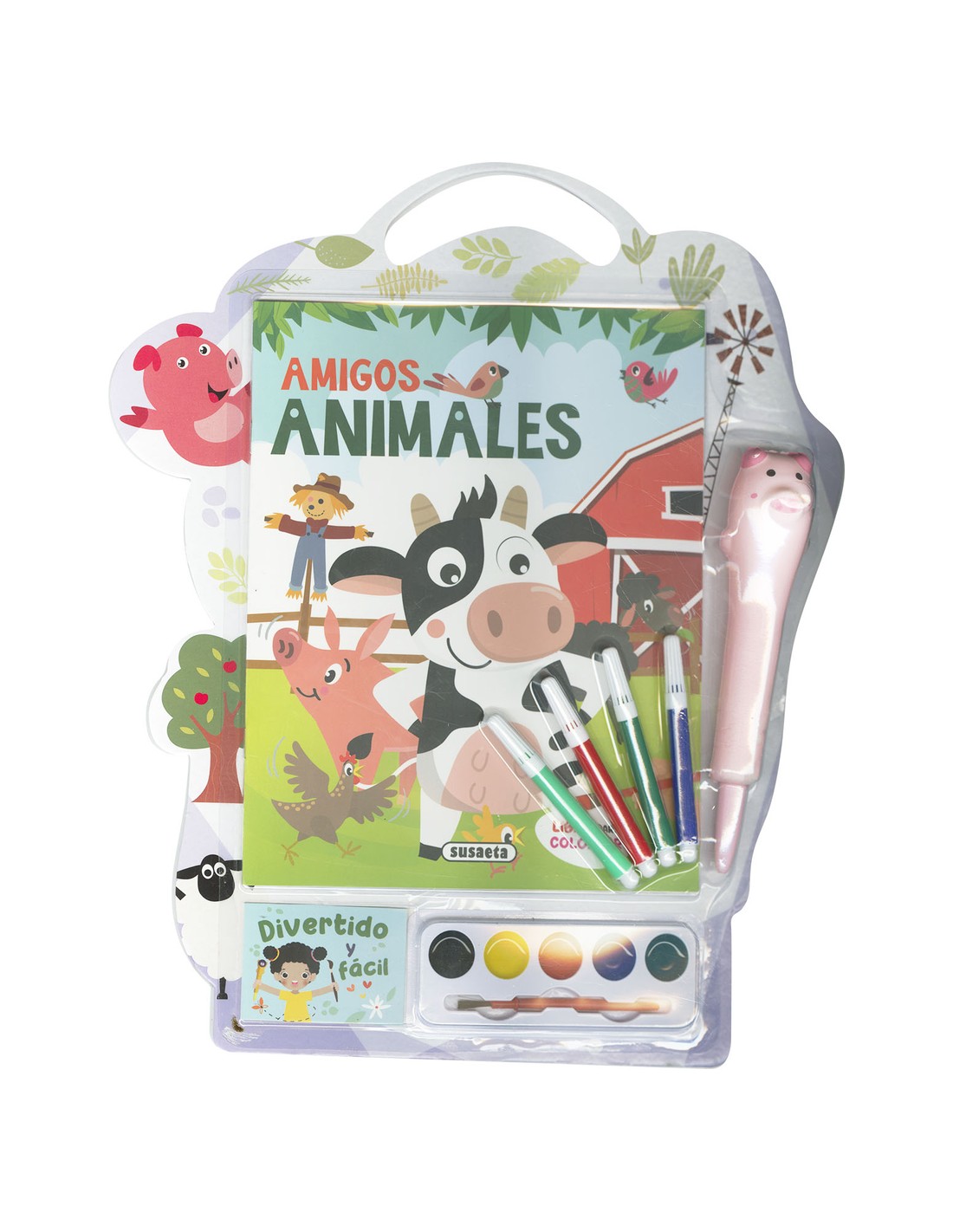 Un completo set de colorear que incluye rotuladores, acuarelas, un pincel y un fantástico boli con forma de cerdito. ¡Fácil y divertido!