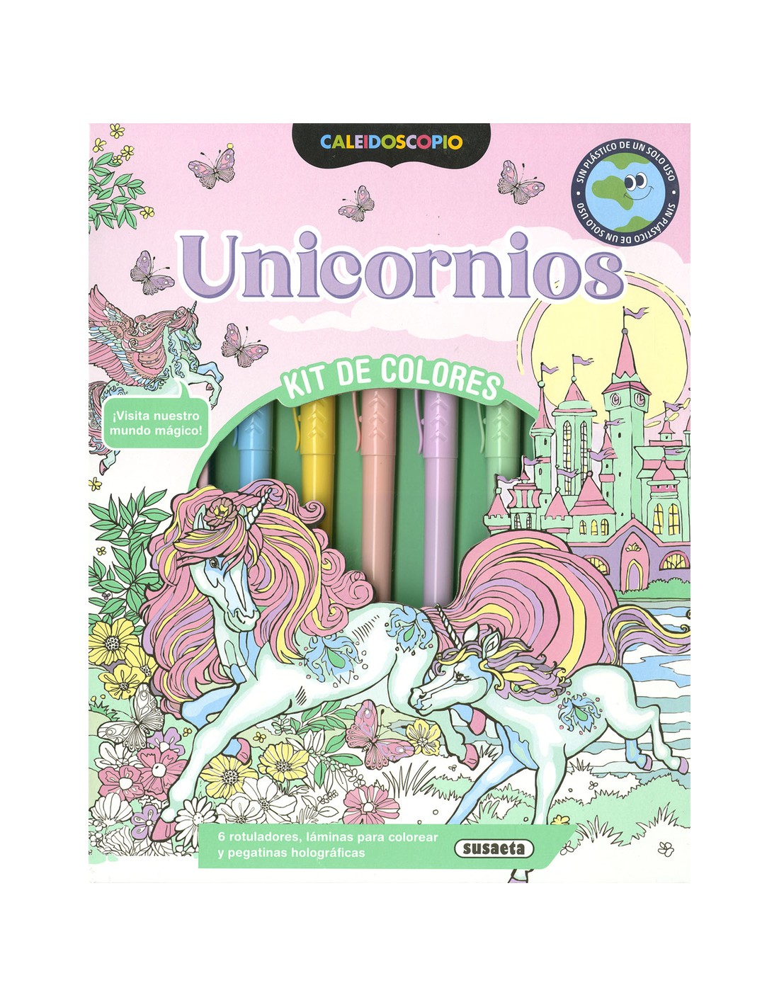 Con este kit de colores podrás dar vida a un mundo mágico: incluye 6 rotuladores de colores pastel que podrás utilizar para colorear las láminas, y pegatinas brillantes de unicornios para decorar tus carpetas y cuadernos. Usa los rotuladores y vuélvelos a guardar en su lugar: ¡así no los perderás!