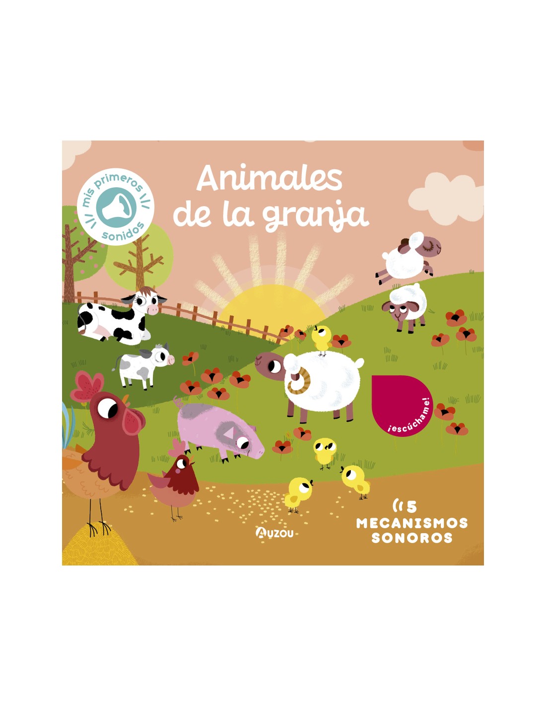 ¡Escucha y reconoce las voces del gallo, el cerdo, la oveja, la vaca y el burro! Disfruta una y otra vez de los sonidos de los animales de la granja con este libro cuidadosamente ilustrado y sus 5 mecanismos sonoros de larga duración. Incluye una última doble página que muestra todos los animales de la granja presentados a lo largo del libro con fotografías reales, ¡perfectas para estimular el desarrollo del lenguaje y el aprendizaje de vocabulario de los más pequeños de la casa! Fabricada en cartón grueso con esquinas redondeadas y con 5 sonidos para reconocer, la colección Mis primeras imágenes para escuchar presenta preciosas ilustraciones y cuidados sonidos para disfrutar y descubrir la naturaleza, los transportes, los animales y sus crías, o los instrumentos.