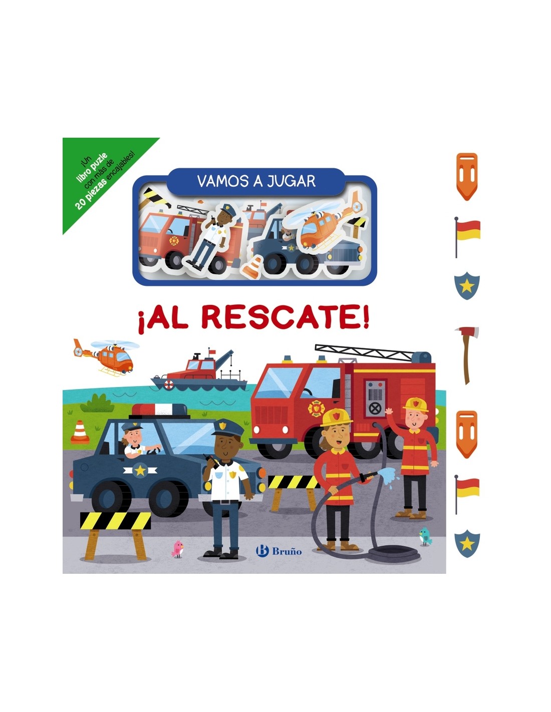 Bomberos, policías, guardia costera, médicos... ¡Encaja las piezas de los servicios de rescate!Un maravilloso libro en el que el niño disfrutará conociendo los distintos servicios de rescate: la comisaría de policía, la estación de bomberos, los servicios de urgencias en un hospital y los de la playa. Aprenderá vocabulario y se lo pasará en grande encajando las piezas en su lugar correspondiente. Además, en cada escenario podrá encontrar 5 objetos escondidos. ¡Para aprender y jugar al mismo tiempo!· Caja con un libro de cartón y más de 20 piezas para encajar· Texto en MAYÚSCULAS· Aprendizaje de vocabulario sobre los servicios de rescate: policía, bomberos, servicios médicos y guardia costera· Mejora la coordinación ojo-mano y el conocimiento del entorno· 5 objetos que buscar en cada escenario