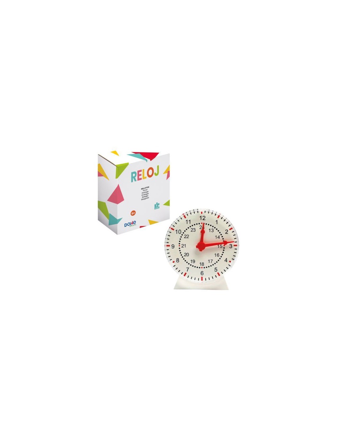 Este reloj analógico con búsquedas de horas y minutos ayuda a los alumnos a entender la medida del tiempo y el paso del tiempo. La esfera está dividida en los números de las 12 horas y las marcas de los minutos. Una ruedecilla permite mover las agujas y, así, representar o leer una hora determinada, a transformar, a formato analógico, una hora dada en formato digital. Recomendado para primer, segundo y tercer ciclo de Primaria.