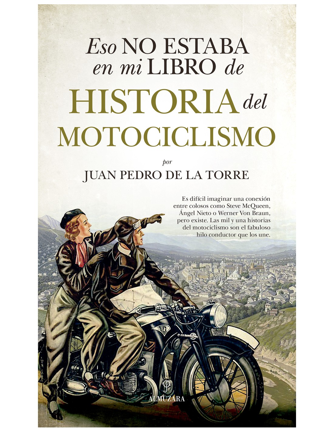 ¿Qué nexo existe entre la lucha contra el fascismo, la carrera espacial norteamericana y la llamada Guerra Fría ¿Ninguno Pues aunque parezca increíble, estos tres hitos del siglo XX se encuentran conectados a través de la historia de la motocicleta. ¿Y qué relación mantienen personajes tan diversos como John Surtees, el único hombre que ha sido campeón del mundo de Fórmula 1 y de motociclismo, con el actor Steve McQueen y el guerrillero Ernesto Che Guevara Sencillamente, que una moto les cambió la vida. Eso no estaba en mi libro de historia del motociclismo es un recorrido a lo largo del fascinante mundo de la moto, en el que descubrimos momentos insólitos, personajes absolutamente fascinantes, e historias de superación. Es una verdadera aventura de principio a fin que nos desvela la creación de una nueva industria y toda su complejidad, su contribución al desarrollo de la automoción en momentos claves de la sociedad del siglo XX, su eterno desafío frente al potencial económico de las industrias automovilistas, y el atractivo del embriagador mundo de las carreras, repleto de figuras tan brillantes como otras realmente esperpénticas. Escrito en un tono ameno, desenfadado, en ocasiones casi burlón, el autor nos conduce por un mundo repleto de sorpresas, un escenario adictivo, en el que, una vez más, la realidad superará todo cuando pudiéramos haber imaginado. «Juan Pedro de la Torre es una auténtica enciclopedia humana del motociclismo» Mela Chércoles, Diario As
