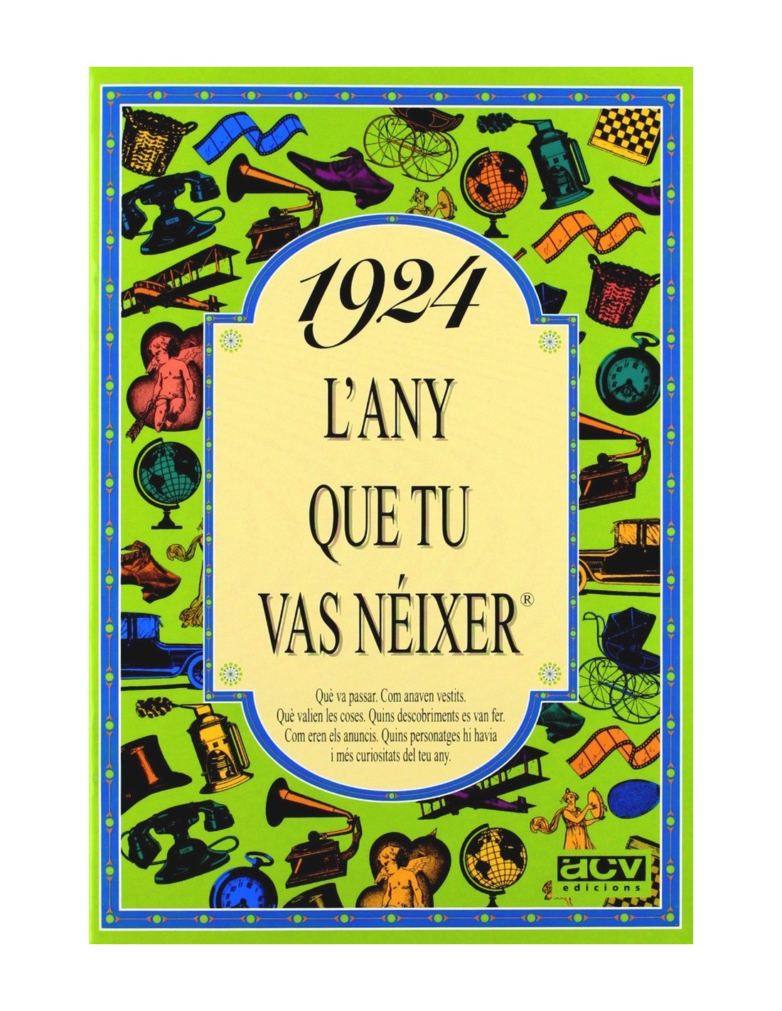El llibre de 1924 conté una selecció de notícies curioses que van passar aquell any, imatges, anuncis i en general tot allò per entendre com era el món aquell any, com era la moda, què es va inventar, quins anuncis hi havia, les cançons i les pel·lícules d'èxit, quant valien les coses, quins personatges famosos destacaven, i moltes coses més. Aquest llibre de 1924 forma part de la popular col·lecció "L'any que tu vas néixer". Un detall ideal per al protagonista de la festa d'aniversari, o per sorprendre a cadascun dels convidats del teu proper sopar amb amics o família. Posa el llibre de l'any de cada convidat al seu lloc de la taula i veuràs la sorpresa quan se'l trobin. De seguida es trencarà el gel amb converses apassionades plenes de records. La col·lecció "L'any que tu vas néixer" va de 1920 a 2005.
