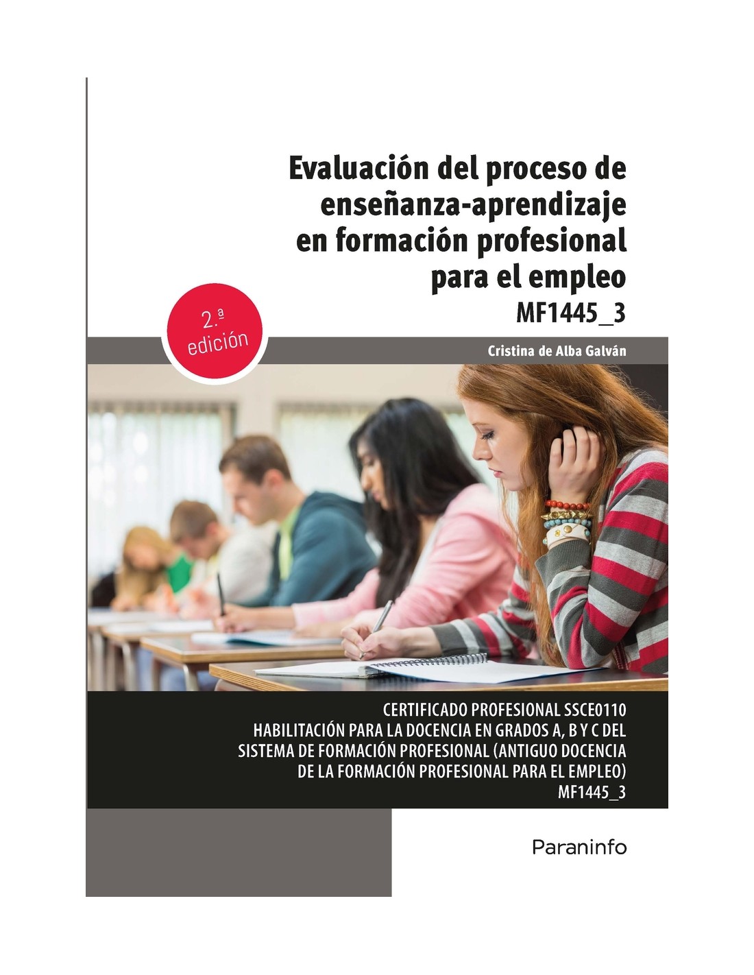 Uno de los aspectos fundamentales en el desarrollo de las acciones formativas para el empleo es la evaluación de las actividades de enseñanza-aprendizaje. En este manual veremos cómo realizar un certero análisis de los principios fundamentales de la evaluación, así como las formas que esta puede adoptar en función de su finalidad, los medios de que se dispongan y el colectivo al que esté dirigida. Por otra parte, aprenderemos a elaborar pruebas de evaluación teóricas y pruebas prácticas para distintas modalidades de impartición, analizando la información obtenida a lo largo de todo el proceso formativo y efectuando la evaluación de las tareas y actividades presentadas por el alumnado en la modalidad de formación online. Cada epígrafe se complementa con actividades prácticas y de autoevaluación, cuyas soluciones están disponibles en www.paraninfo.es. Los contenidos del libro se corresponden con los del MF1445_3 Evaluación del proceso de enseñanza-aprendizaje en formación profesional para el empleo, perteneciente al certificado profesional SSCE0110 Habilitación para la docencia en grados A, B y C del sistema de formación profesional para el empleo (antiguo Docencia de la formación profesional para el empleo), y regulado por el RD 625/2013, de 2 de agosto. Cristina de Alba Galván es licenciada en Psicología y Máster en Dirección y Gestión de Recursos Humanos.