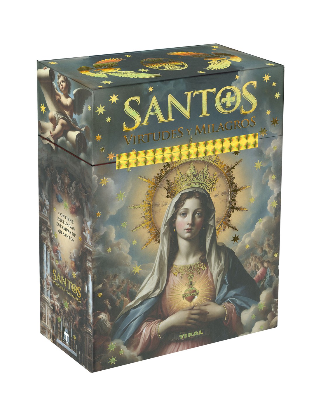 Caja que contiene 40 estampas de santos del cristianismo, representados en hermosas obras pictóricas, además de un libro de 80 páginas que muestra su vida y ejemplo, qué santo se festeja cada uno de los 365 días del años y un capítulo especial dedicado al culto a la Virgen María.