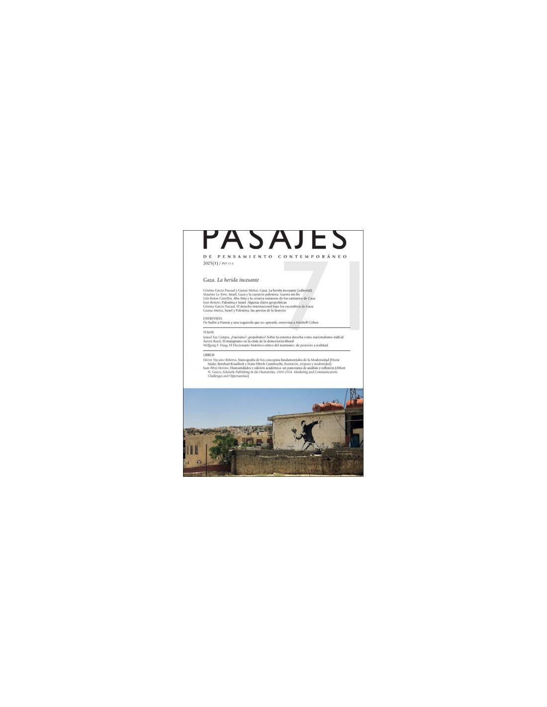 El número 71 de la revista 'Pasajes' incluye un dossier titulado "Gaza, la herida incesante", que reúne trabajos sobre el conflicto en Oriente Medio y de las masivas violaciones de derechos humanos que hoy se están produciendo en tierra palestina, escritos por Cristina García Pascual, Gustau Muñoz, Massimo La Torre, Lola Bañón Castellón y Joan Romero, así como una entrevista a Mitchell Cohen. Además, este número también incluye artículos de Ismael Saz Campos, Aurora Bosch y Wolfgang F. Haug.