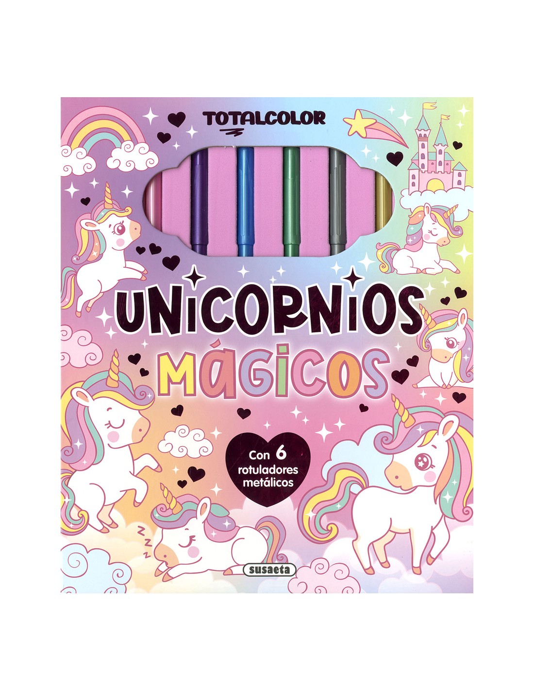 Colorea y crea brillantes dibujos de unicornios con los rotuladores metálicos. Hay 24 láminas y 6 rotuladores: ¡un libro de colorear deslumbrante!
