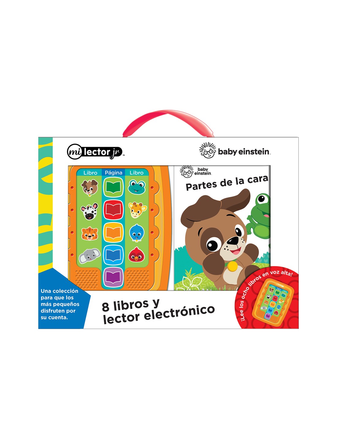 Lector electrónico y biblioteca de 8 libros de cartón para los más pequeños con encantadoras narraciones, sonidos divertidos, música y rimas.