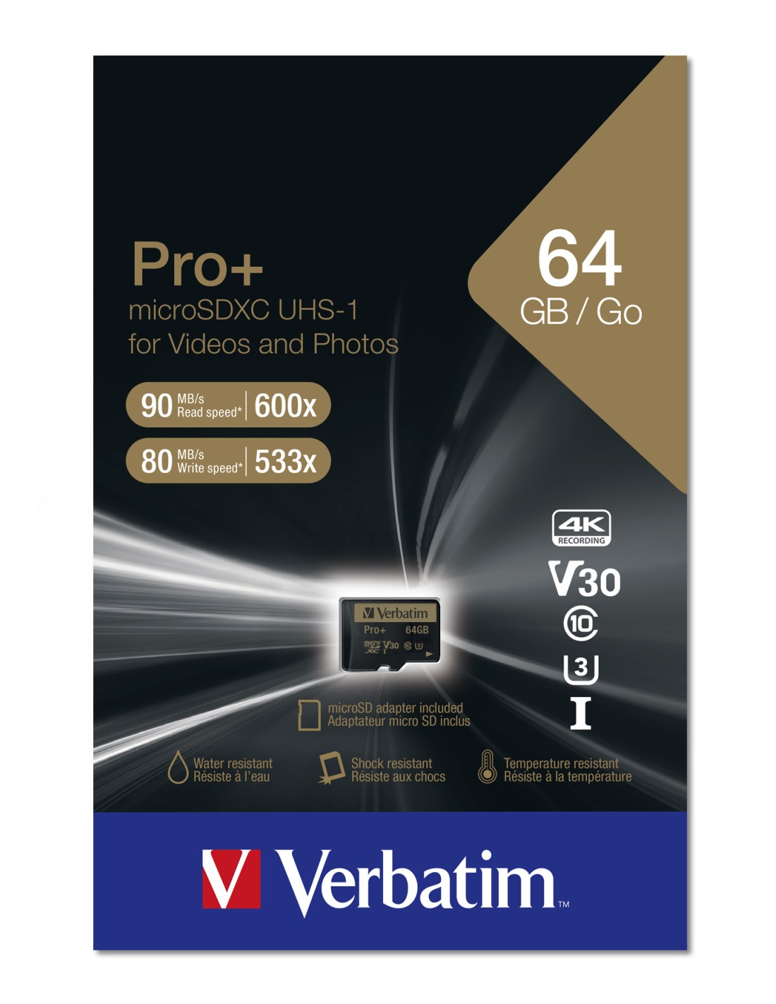 Las tarjetas de memoria Verbatim Pro+ microSD son resistentes al agua y a los golpes.