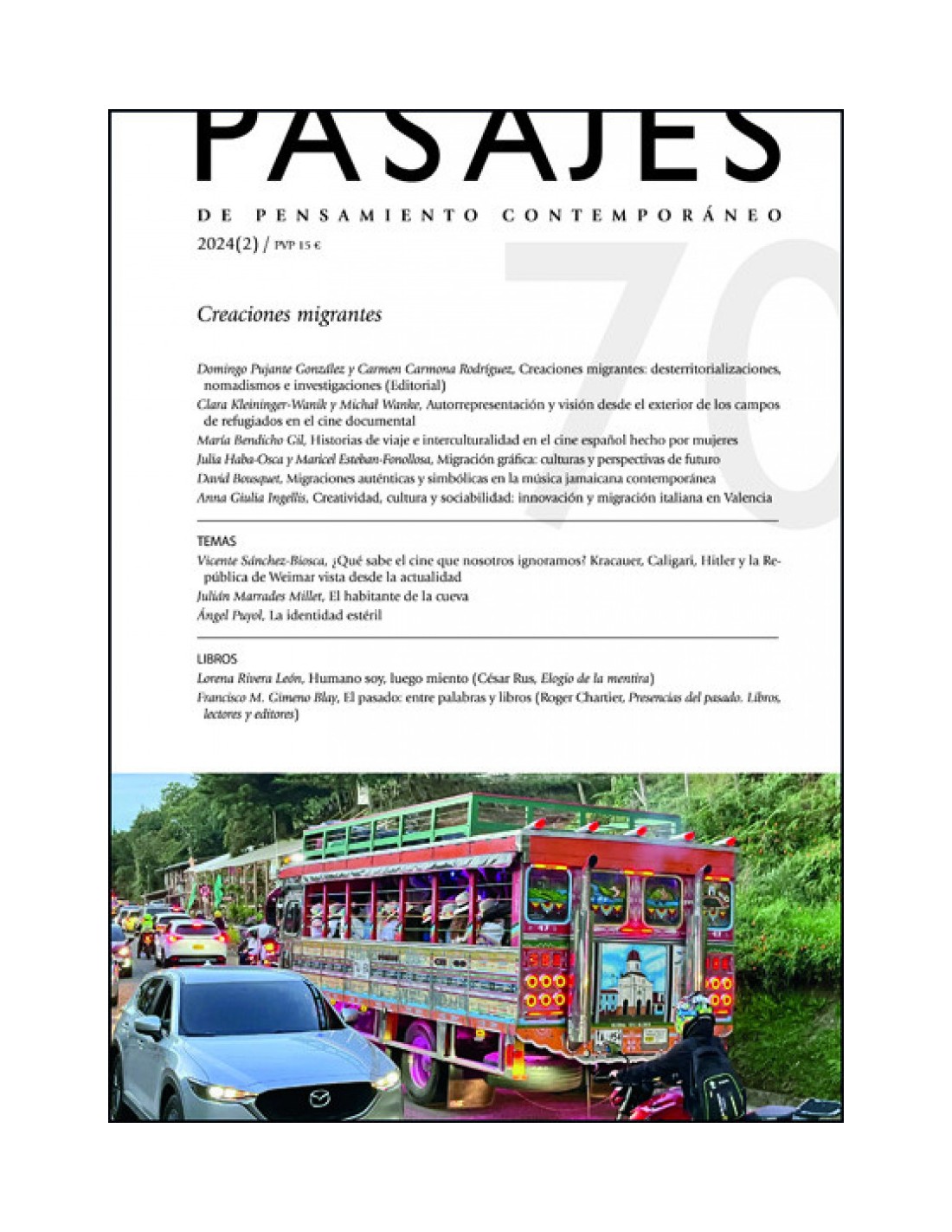 El número 70 de la revista 'Pasajes' incluye un dosier titulado "Creaciones migrantes", que reúne trabajos sobre las manifestaciones, producciones o creaciones culturales realizadas por personas migrantes o sobre ellas, escritos por Domingo Pujante González, Carmen Carmona Rodríguez, Clara Kleininger-Wanik, Michał Wanke, María Bendicho Gil, Julia Haba-Osca, Maricel Esteban Fonollosa, David Bousquet y Anna Giulia Ingellis. Además, este número también incluye artículos de Vicente Sánchez-Biosca, Julián Marrades Millet y Ángel Puyol.