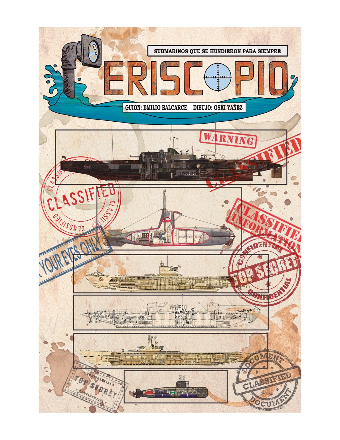 Periscopio recoge varias historias reales sobre submarinos que acabaron hundidos en el fondo del mar. Ofrece, además, una amplia visión de conjunto, pues recorre desde el primer submarino que entró en combate en la guerra de Secesión hasta algún caso reciente. Así, conoceremos el devenir del Surcouf, de la Armada francesa, por entonces el submarino más grande del mundo, que portaba un hidroavión en su interior y que tuvo una historia muy particular al quedar Francia como territorio ocupado durante la Segunda Guerra Mundial. La historia del submarino argentino Ara San Juan y del italiano Macallé, cuyos avatares, aun separados por décadas, se dirían interconectados, se nos narra en paralelo. Del frente del Pacífico se rescatan varias historias, como la de los cinco submarinos enanos nipones que atacaron Pearl Harbor o el USS TANG SS306, uno de los más activos de la Armada estadounidense. No podía faltar el misterio del U-333, sobre el cual este cómic aporta toda la documentación conocida. En suma, Periscopio nos muestra historias reales, sorprendentes, con tripulaciones al límite, rayando en el heroísmo, gracias a la documentación de un guionista tan experimentado como Emilio Balcarce y a la narrativa que despliega el dibujante Oski Yañez;una invitación a sumergirse en la historia.