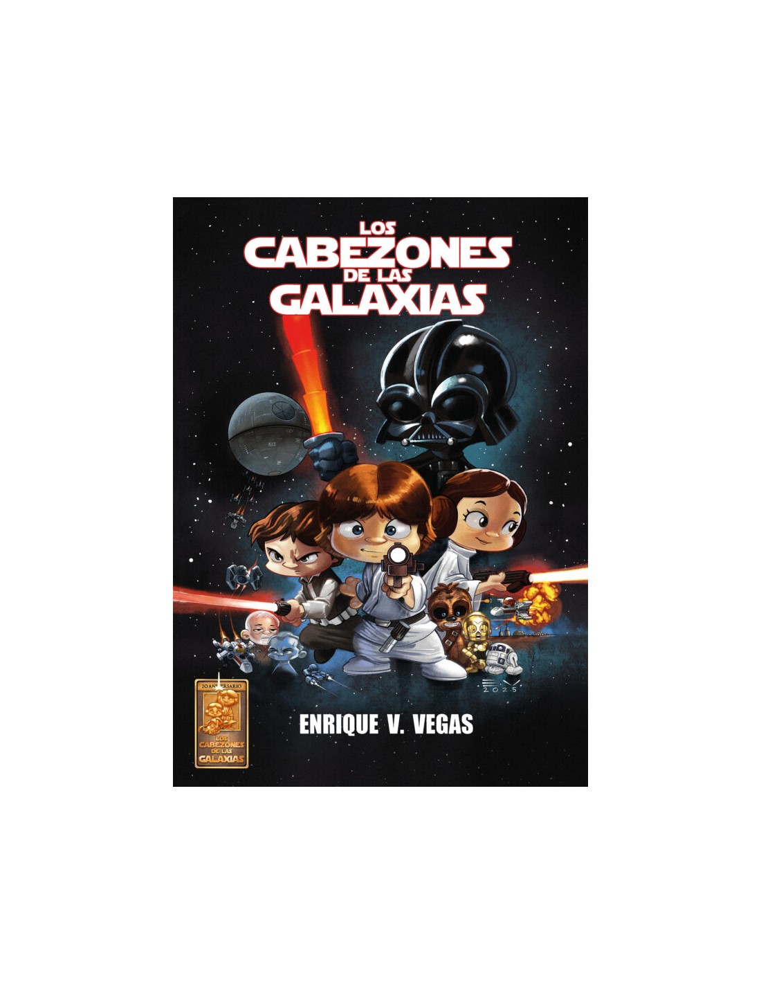 En 2005, Enrique V. Vegas se lanzaba a parodiar la saga galáctica por excelencia. Los tres títulos, Los Cabezones de las Galaxias, El retorno del Cabezón y El Cabezón Contraataca se convirtieron rápidamente en los favoritos del público. Desde entonces, muchas han sido las películas y series que han pasado por el tamiz de Enrique y su particular estilo, desde la trilogía de precuelas hasta las series más recientes: El Cabezoniano y Asako. En el 20º aniversario de su publicación, este volumen integral a todo color recopila la trilogía original, homenaje tanto a los seguidores del universo cabezón como a su propio autor.