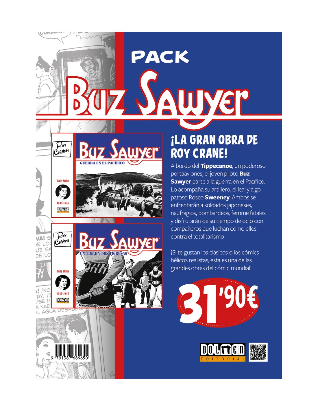 ¡La gran obra de Roy Crane! A bordo del Tippecanoe, un poderoso portaaviones, el joven piloto Buz Sawyer parte a la guerra en el Pacífico. Lo acompaña su artillero, el leal y algo patoso Rosco Sweeney. Ambos se enfrentarán a soldados japoneses, naufragios, bombardeos, femme fatales y disfrutarán de su tiempo de ocio con compañeros que luchan como ellos contra el totalitarismo ¡Si te gustan los clásicos o los cómics bélicos realistas, esta es una de las grandes obras del cómic mundial!
