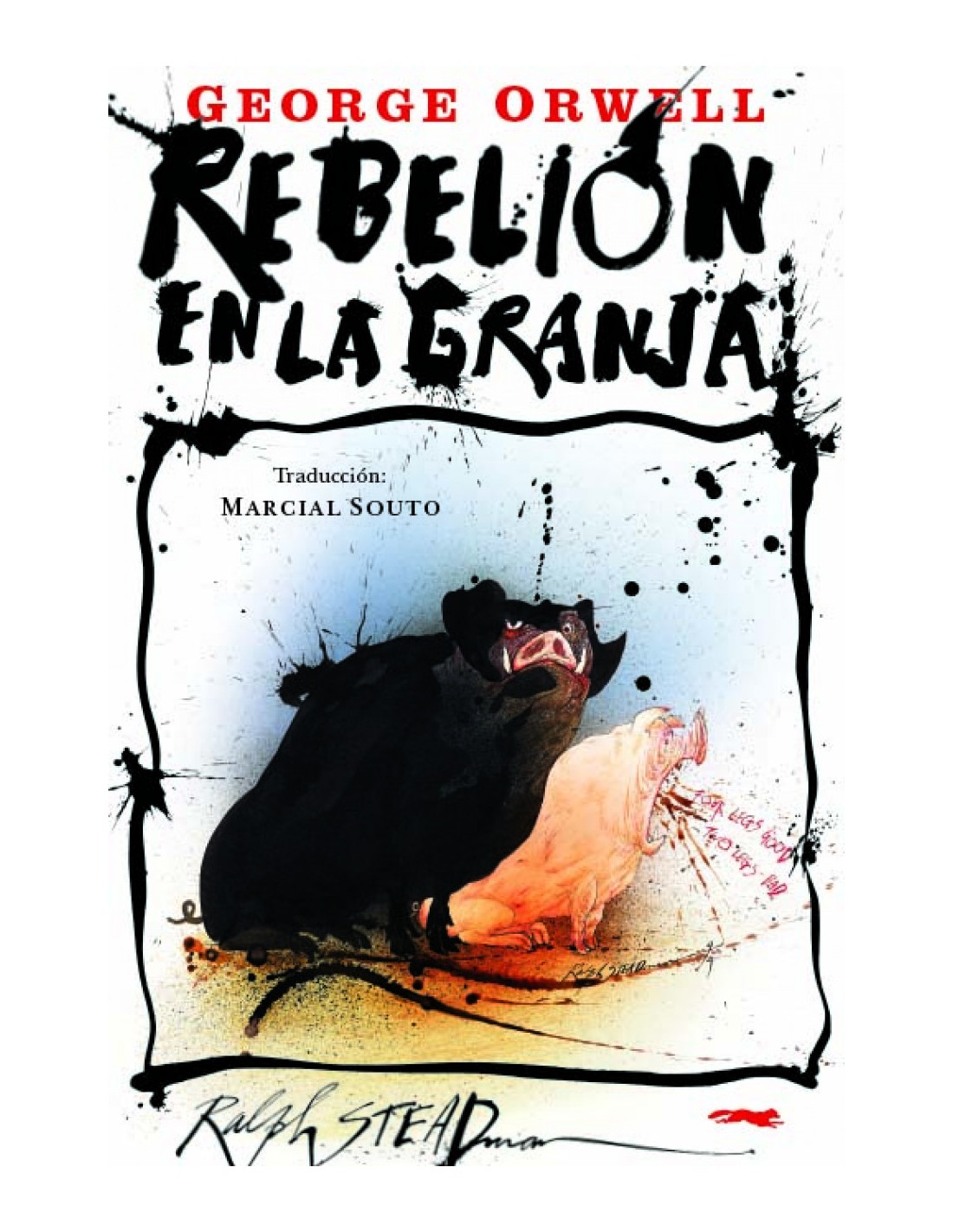 La obra maestra de Orwell recrea el ambiente de las fábulas clásicas (Esopo, La Fontaine) para trazar un escenario en el que los animales son protagonistas de una revolución que pronto devendrá en una caricatura de sí misma. A través de esta precisa parábola, la novela despliega un alegato mordaz e implacable contra toda forma de totalitarismo. Escrita en 1945, en la inmediata posguerra, Rebelión en la granja denuncia el germen corrupto que se propaga en muchas revoluciones, cuando sus élites dirigentes abjuran de los ideales originarios y adoptan conductas y rituales característicos del sistema opresor que pretendían suplantar. Manipulación de ideales y ceguera ante injusticias flagrantes son algunos de los rasgos que los protagonistas de esta obra encarnan para espejar, así, vicios humanos que quedan perfectamente resumidos en el lema: «Todos los animales son iguales, pero algunos son más iguales que otros». Ralph Steadman, el gran maestro internacional de la satira política y social, refuerza, con sus ya célebres y característicos salpiconazos de tinta, las escenas de álgida violencia que, desde el texto, pasan a las estampas sin perder un ápice de su potencia turbadora.