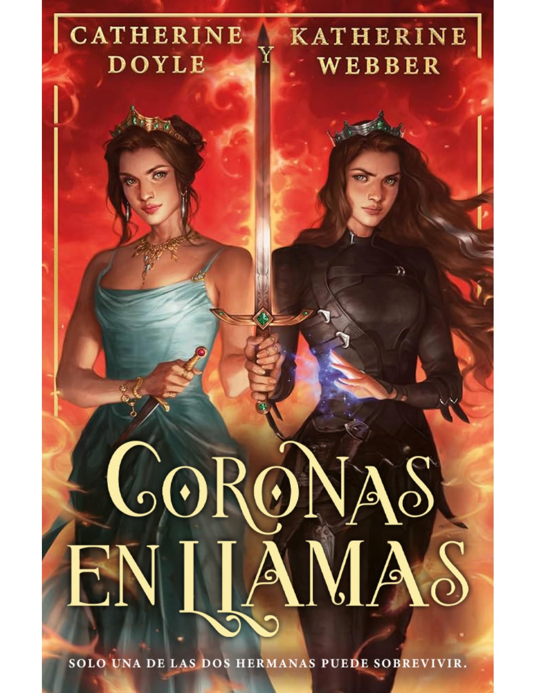 Coronas en llamas es el último libro de la trilogía fantástica sobre dos princesas separadas al nacer que comenzó con Coronas gemelas, de las autoras Catherine Doyle y Katherine Webber. Rose y Wren le han devuelto la magia al reino, pero las sombras aún acechan Desde que Wren ejecutó un hechizo de sangre, su magia se ha vuelto incontrolable. De hecho, ha creado un vínculo entre ella y el hombre al que trata de olvidar: el rey Alarik. Para arreglarlo, deberá viajar a las montañas del norte bajo la protección del capitán de la guardia, Tor Ivensen. Rose ha sido amenazada por su ancestro Oonagh Starcrest: o abdica o el reino entrará en guerra. Rose buscará la ayuda de Shen-Lo, pero al hacerlo podría encontrar algo que le rompa el corazón. Mientras las hermanas tratan de salvar el reino, van a verse obligadas a realizar un sacrificio para el que puede que no estén preparadas.