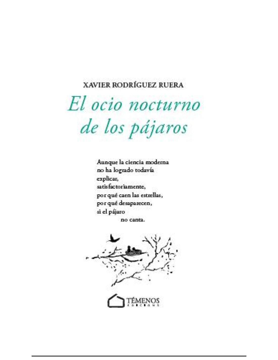 Nadie que aborde con franqueza una lectura poética sale indemne de ella del mismo modo que no volvemos a ser los mismos tras superar un duelo. En El ocio nocturno de los pájaros las causas del dolor, la ruptura o la pérdida que habitan en el substrato de la obra permanecen opacas al lector, pero éste puede reconocerse en ellas y asumir que, sólo digiriéndolas, sólo convirtiendo el tiempo en un proceso orgánico que no admita atajos, conseguiremos superarlas. La advertencia de Caballero Bonald en la apertura del libro es definitoria "No busques la salida: no has entrado" y Xavier Rodríguez Ruera es consciente del envite y asume la escritura como catarsis, aun sabiendo que el proceso no estará exento de desconsuelo. Del epilogo de Toni Quero.