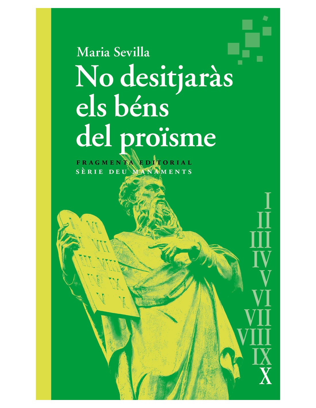 Fem servir societat materialista i societat consumista com a sinònims, però per a la poeta i investigadora Maria Sevilla Paris són exactament el contrari: el capitalisme és un gran deliri de desmaterialització. Vivim immersos en un sistema que ens desvincula de la matèria i que atempta contra els límits orgànics del planeta. Amb un peu a la literatura i l'altre a la filosofia, Sevilla qüestiona el mite del creixement il·limitat i del subjecte autosuficient. I, vinculant la desmesura bíblica i la capitalista, ens proposa veure el concepte de límit des d'un punt de vista nou: tal com passa amb les regles de joc del vers, els límits no són obstacles a vèncer sinó ocasions privilegiades per pensar l'emancipació i la creativitat. La sèrie Deu Manaments vol repensar els grans temes de la contemporaneïtat seguint el fil conductor del Decàleg. Amb una mirada fonda i actual, responent a problemàtiques d'avui, lluny de qualsevol confessionalisme.
