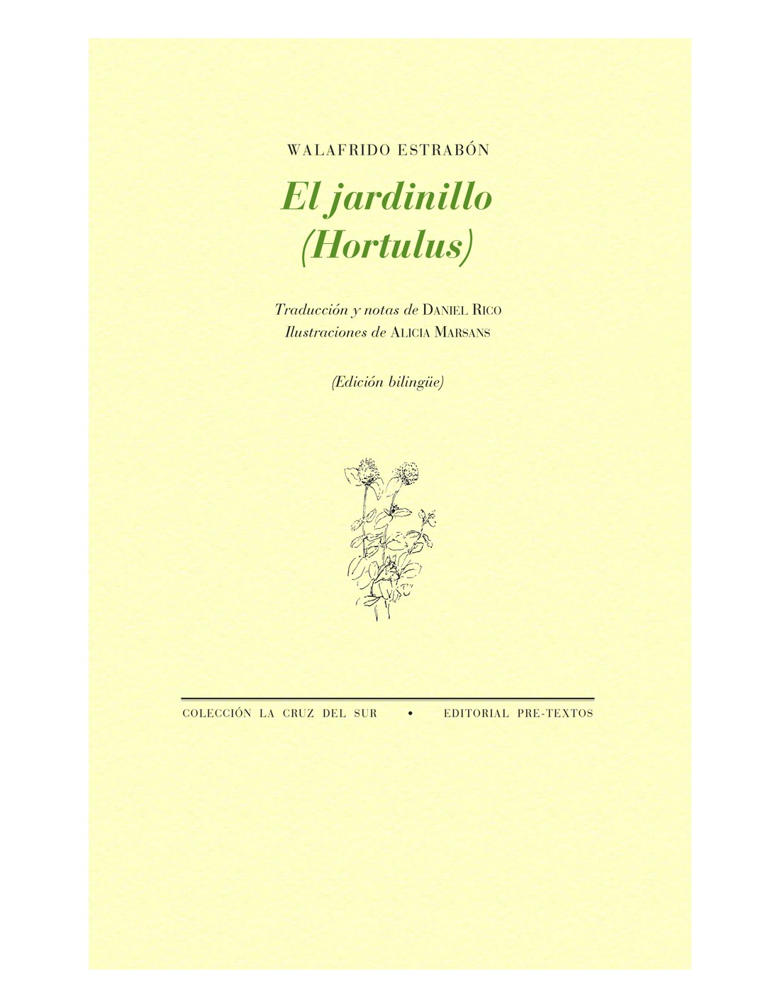 Además de un elogio previo al trabajo de la tierra con la llegada de la primavera, con sus sacrificios y satisfacciones, el cuerpo central de este poema recoge 23 reseñas de plantas medicinales donde se describen con un tono personalísimo sus características y propiedades. La importancia del poema es doble, según lo valoremos en calidad de monumento literario o en cuanto documento histórico. La edición que hoy presentamos es la primera traducción que se hace del poema al castellano, y va acompañada de 23 ilustraciones que la artista Alicia Marsans ha diseñado ex profeso para la ocasión. Walafrido Estrabón (808-849) fue el más grande poeta de época carolingia, monje y teólogo, botánico, diplomático, abad de Santa María de Reichenau y preceptor del príncipe Carlos (el Calvo) en la corte de Luis el Piadoso. De su obra poética sobresalen la Visio Wettini, primer viaje al más allá escrito en verso, un enigmático poema de tenor político titulado De imagine Tertrici («La estatua de Teodorico») y el Hortulus o De cultura hortorum que aquí presentamos.