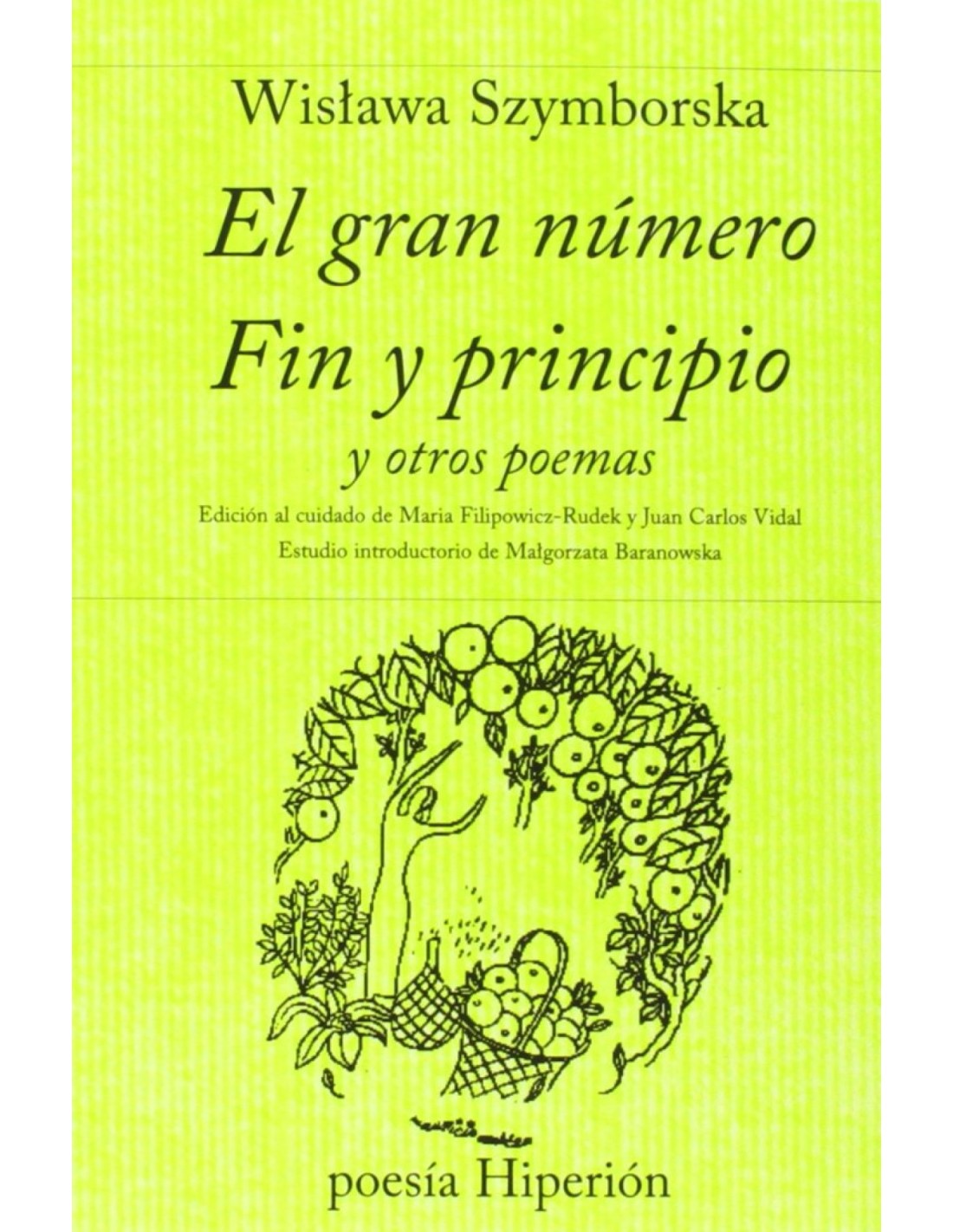 Esta traducción española de la poesía de Wislawa Szymborska está compuesta por dos de sus libros, los considerados más valiosos y representativos de su obra, El gran número y Principio y fin, complementados por quince poemas de sus obras anteriores y cinco más recientes, aún no recopilados en libro por su autora. Contiene asimismo el texto El poeta y el mundo, leído por su autora en Estocolmo con motivo de la recepción del Premio Nobel de Literatura, así como un estudio preliminar: Wislawa Szymborska, poeta de la conciencia del ser, de la reconocida especialista Malgorzata Baranowska. Los textos han sido vertidos al castellano por un equipo de traductores compuesto por Xaverio Ballester, Gerardo Beltrán, El!z!bieta Bortkiewicz, David Carrión Sánchez, Maria Filipowicz-Rudek, María Paula Malinowski Rubio, Carlos Marrodán Casas, Katarzyna Moloniewicz y Abel A. Murcia Soriano, coordinados desde Cracovia y Varsovia respectivamente por Maria Filipowicz-Rudek y Juan Carlos Vidal, responsables de la edición.